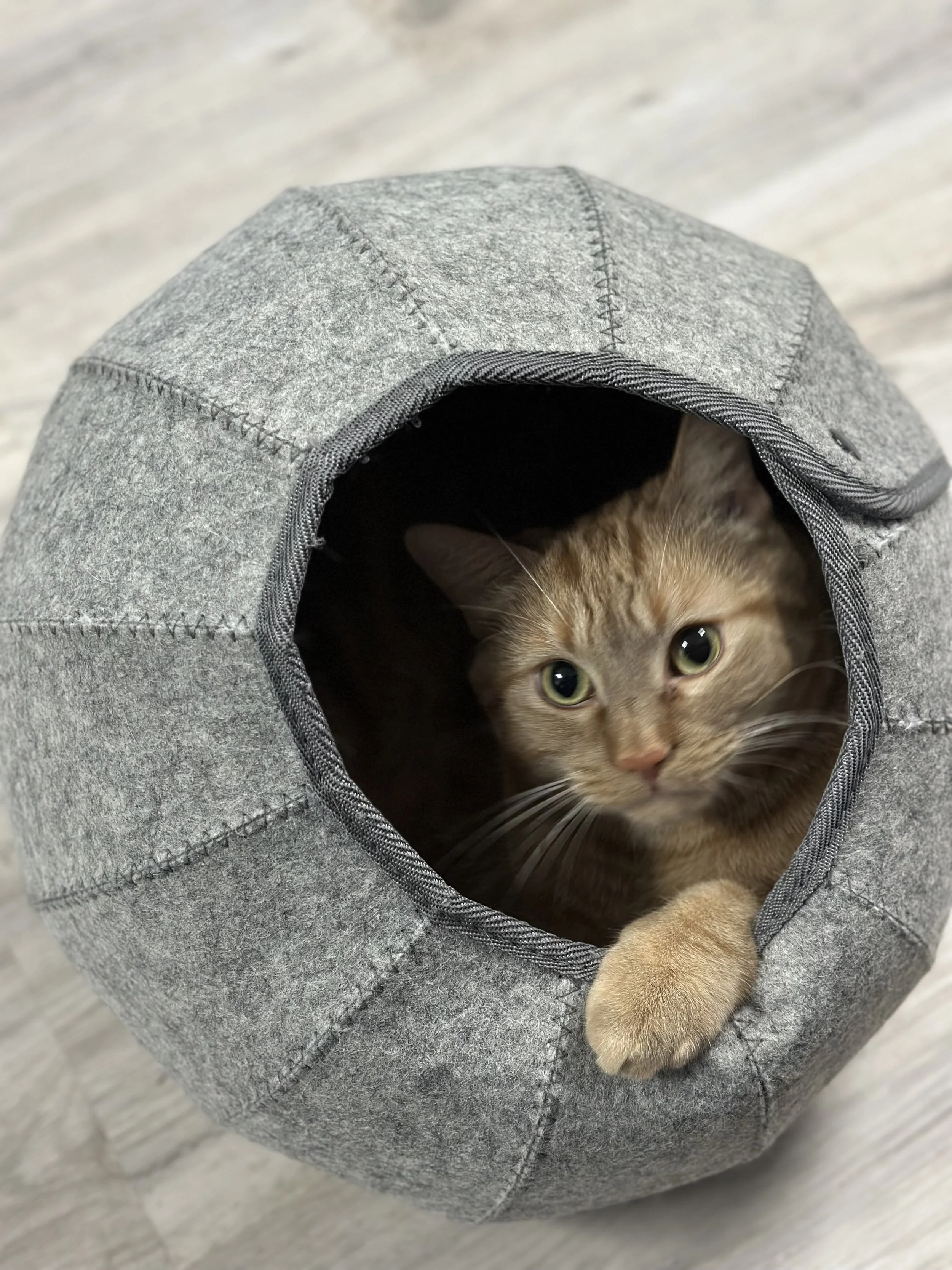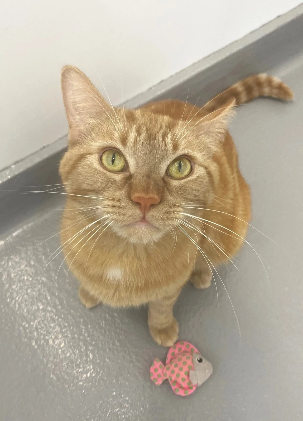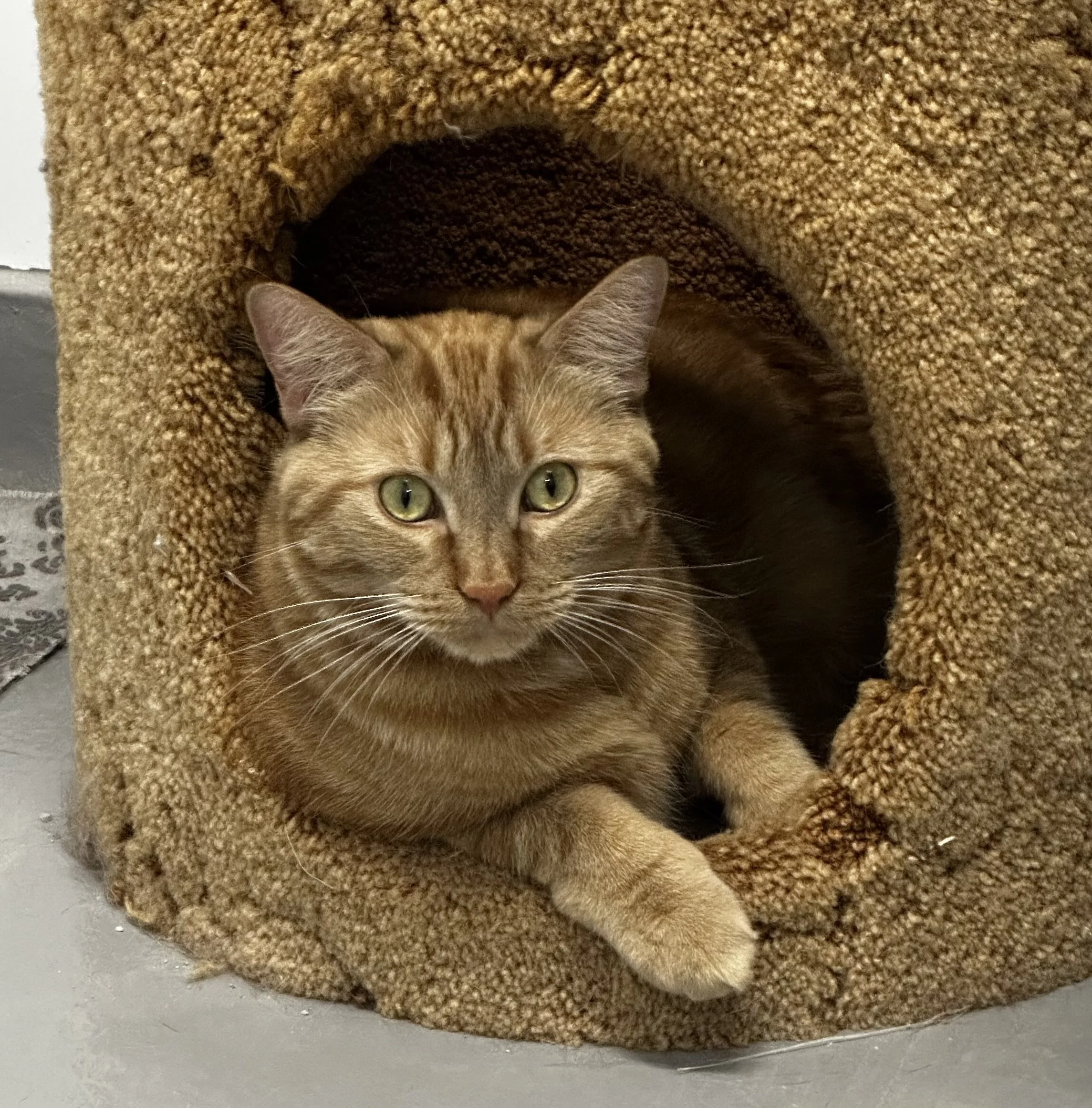 Our handsome Flame! His markings are stunning and his personality is dynamic. Are you aware that orange cats are friendly, calm, affectionate, loyal and have great purr-sonalities? They are known to attach themselves very readily to humans. These attributes describe our Flame perfectly. He makes friends with the newbie cats as they join him in the Whisker Haven room and often becomes a wrestling partner to the young-and-willing cats. Once he has exerted his energy, he is ready for affection and some serious skin exfoliation as he licks your hand, wrist and arm (any exposed skin he can get his tongue on!). Flame is very smart and loves his food! If there is a home that is looking for an all-round fantastic cat, then come and meet our Flame.